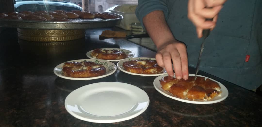 على طاولة رخامية يتناوب أبو عبدو مع مجموعة من العاملين في محله على تمسيد رقائق العجين بالسمن تمهيداً لتوريقها وتحويلها لحلوى الشعيبيات ، التي تتصدر قائمة الحلويات المفضلة في إدلب، وباتت من الموروث الشعبي لهذه المدينة.