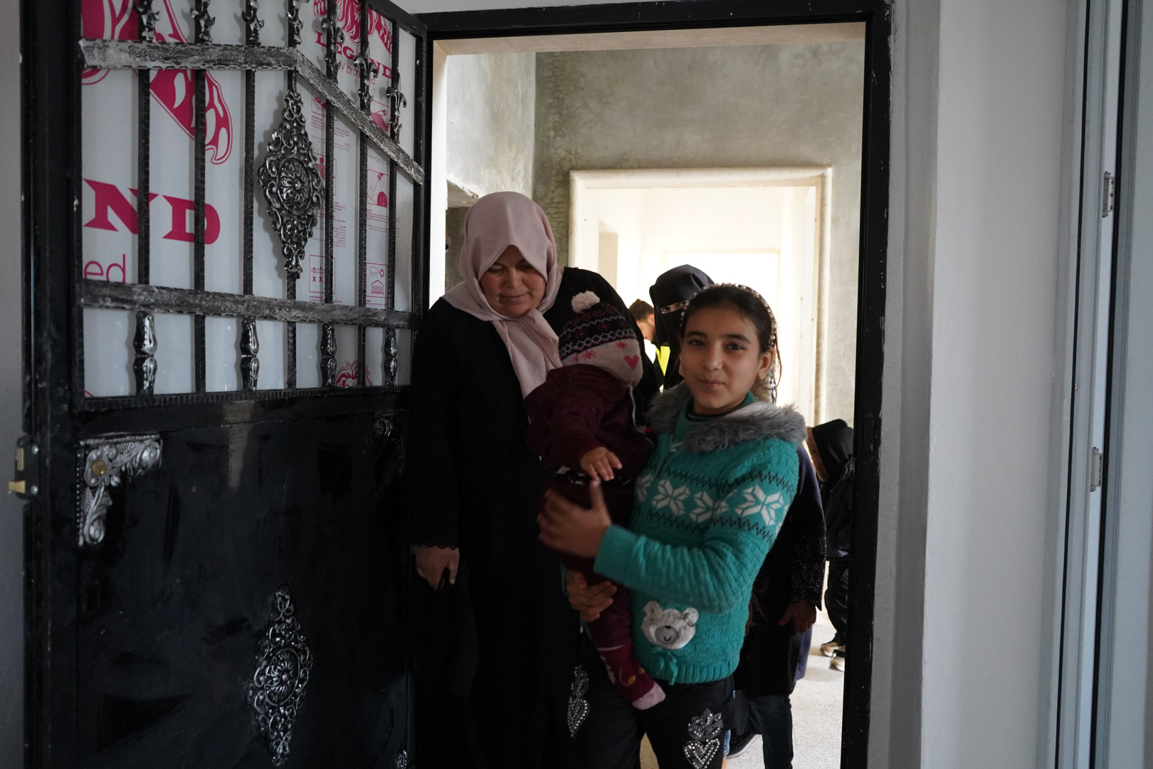 الضحكة مرسومة على وجه طفلة أم عدنان، في الوقت الذي تبدي تعابير وجه طفلها كثيراً من الدهشة وهو يمسك بوالده الذي يعرّفه على منزلهم.