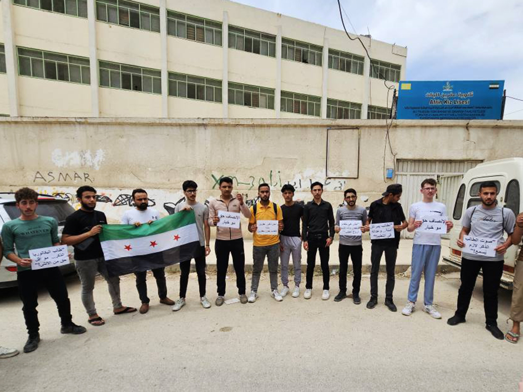 وشهدت مديرية تربية عفرين، اليوم، وقفة احتجاجية نظمها طلاب الثانوية العامة الأحرار أمام مبنى المديرية، لإنصافهم ونقل مراكزهم الامتحانية إلى مدينة عفرين، رفضاً للقرار الأخير بعدم نقل مركز تقديمهم من حلب إلى مدينة عفرين، بما يمنح الذكور والإناث حقوقاً متساوية.