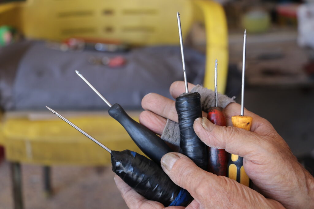 يجلس على كرسيه أمام طاولة محاطًا بأكوام الأحذية، يركن عليها أدواته اليومية: إبر، خيوط، مقصات، مخارز، مسامير ومطرقة. يغلف أصابع كفه بقطع قماش لتجنّب الوخز. يمسك حذاءً مهترئًا ويطرق على المسامير الصغيرة بدقة وخفّة.