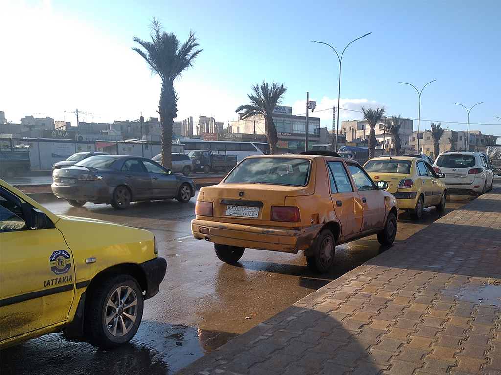 اللون الأصفر الذي ارتبط بـ “التكسي” يفرض حضوره وسط أرتال السيارات المزدحمة. في مفارق الشوارع تصطف عشرات منها، معظمها من نوع “سابا”، التكسي الأكثر شهرة في المدن السورية، إلى جانب عدد قليل من سيارات “لانسر” القديمة وأنواع أخرى من “ماتيز” و”تيكو” و”كيا ريو”.